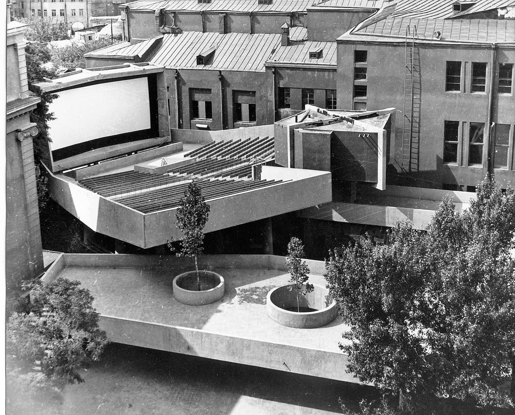 Скульптурность — важная особенность раннего периода армянского модернизма. Кажется, это было желание предельно соответствовать возможностям железобетона, выразить его гибкость и пластичность. Но не было ли это также желанием соответствовать традиции — именно традиции, несмотря на то, что главной целью было, конечно, добиться авангардности. Я говорю о традиции создания в классической армянской архитектуре невообразимо совершенной архитектоники, составленной из каменных форм постройки и образованных ими же воздушных силуэтов — «умении выдохнуть <…> камень» [7]. Своеобразных мегаскульптур в национальном ландшафте (при том, что важнейшим качеством здесь является единство каменного рельефа и возведённой на нём архитектуры). Не это ли имел в виду профессор Ю. Волчок, анализируя решение летнего кинозала? (К его высказыванию я вернусь позже.)
