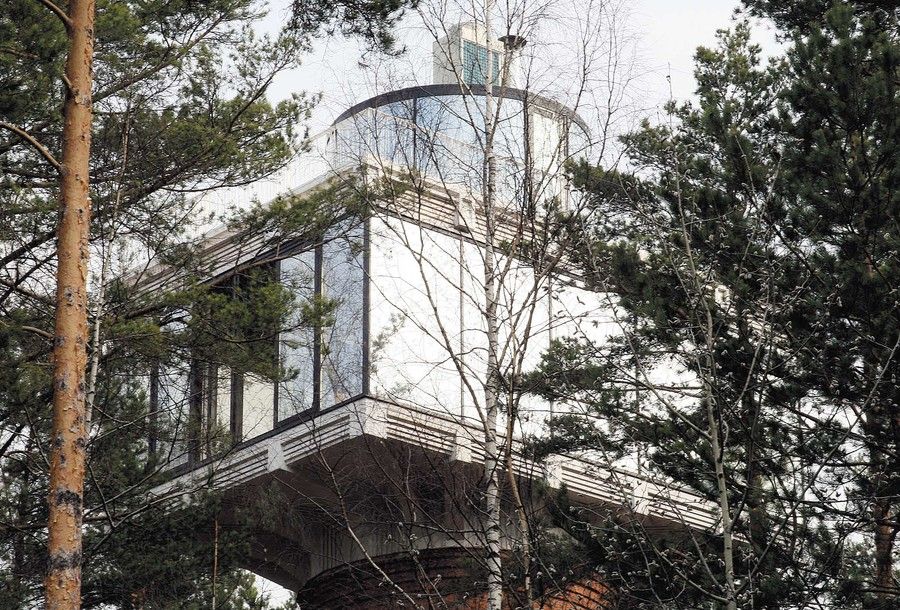 Три стороны гостиной остеклены и открывают прекрасный вид на реку. В центр гостиной приводит винтовая лестница из башни, здесь же установлен камин. Над лестницей с камином запроектирован круглый верхний фонарь, что дает дополнительный свет в главное помещение и на лестницу.