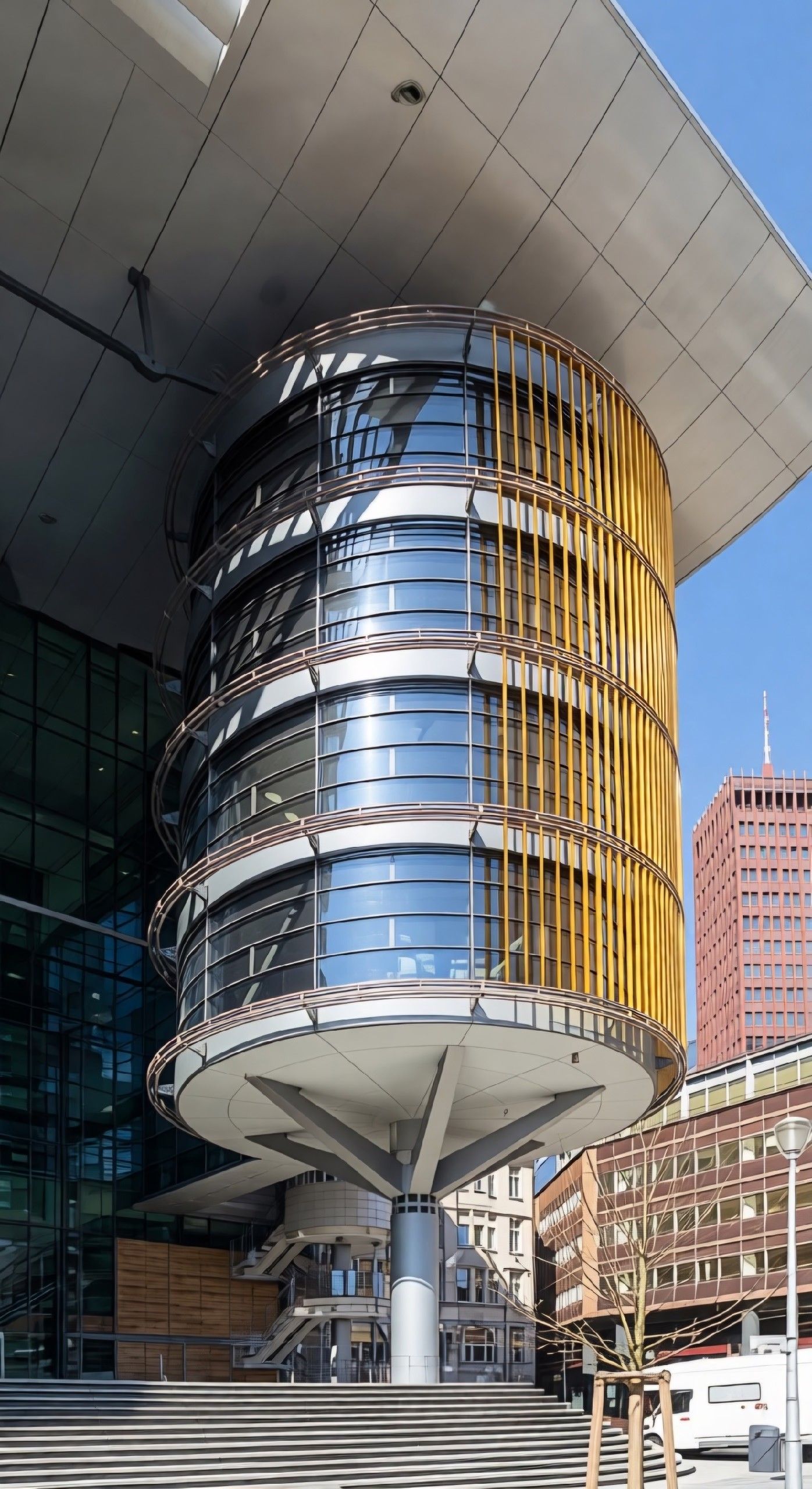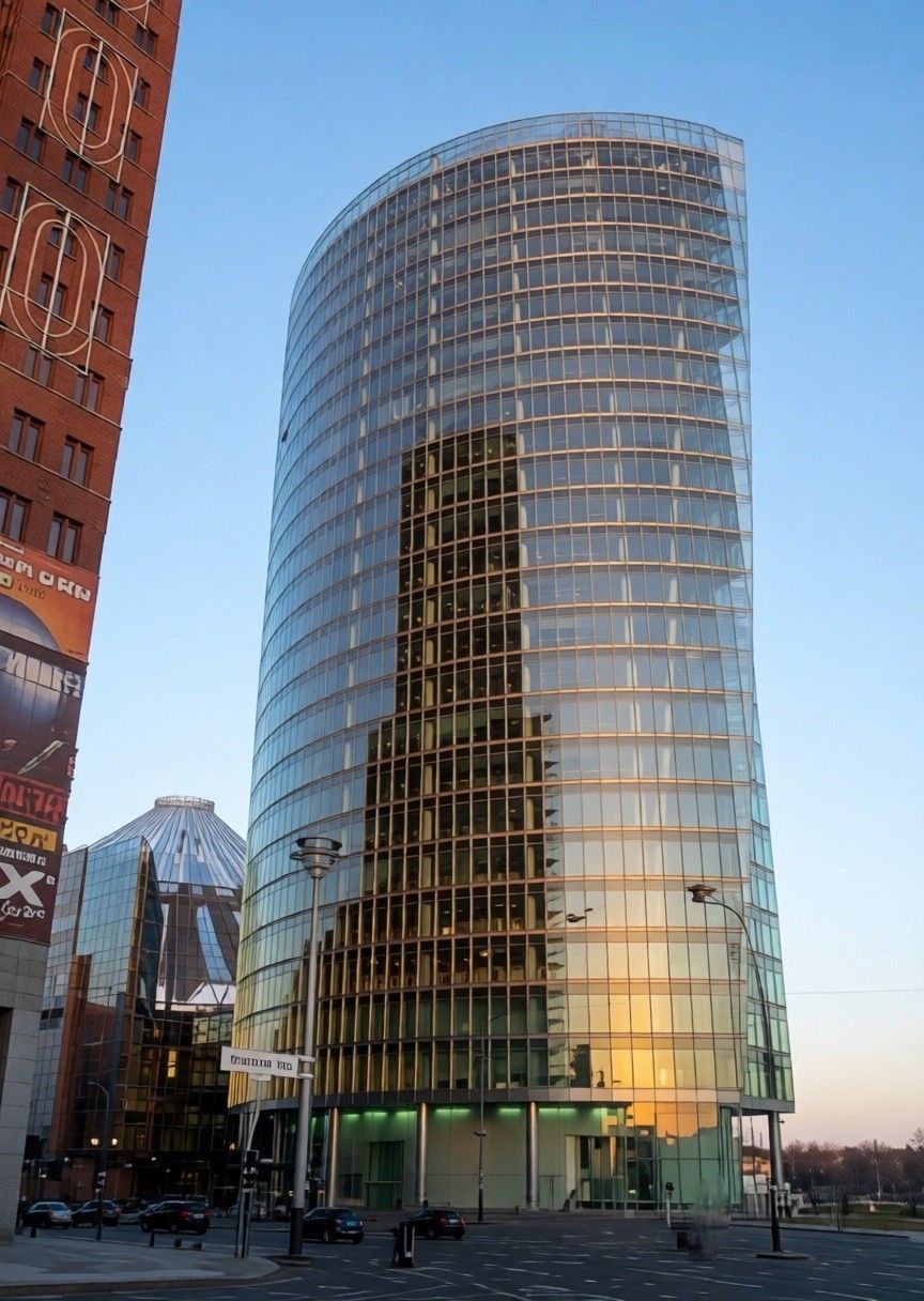 Эту башню создал Ханс Кольхоф, архитектор, который видит в традиции больше современности, чем другие его коллеги. Его здания живут историей. Кольхоф соорудил дом, который причисляется к самым высоким в городе. В Берлине он считается высотным зданием и может сдавать свою террасу на крыше под городскую смотровую площадку, а где-либо другом месте его никто бы и не назвал высоким. Прогуливаясь между стройными колоннами и контрфорсами башни, невольно устремляешь глаз в распростертую перед ним бесконечность: в сторону башни Дебис с зелеными кубиками или в сторону Sony-Areal с его раскрытым зонтом, мимо купола Рейхстага – нового национального символа Германии, и мимо Фридрихштадта, где высотное здание GSW со своим красно-оранжевым текстильным фасадом стремительно уходит ввысь. Тот, кто оглядел новые силуэты Берлина с треугольной смотровой платформы, несмотря на запутанное многообразие города, ощущает в себе переполненность. Но это, наверно, и есть душа здания, которая способна заворожить посетителя. Для того, чтобы найти приемлемую форму своего первого высотного здания, Кольхоф долго изучал историю. В итоге архитектор соорудил здание, которое посредством различных абстрактных элементов непроизвольно вызывают чуткость у своего наблюдателя. При этом он не возвел готический собор. Однако само место имеет магию тех овеваемых ветром башен, которые мастера архитектуры доводили до совершенства.