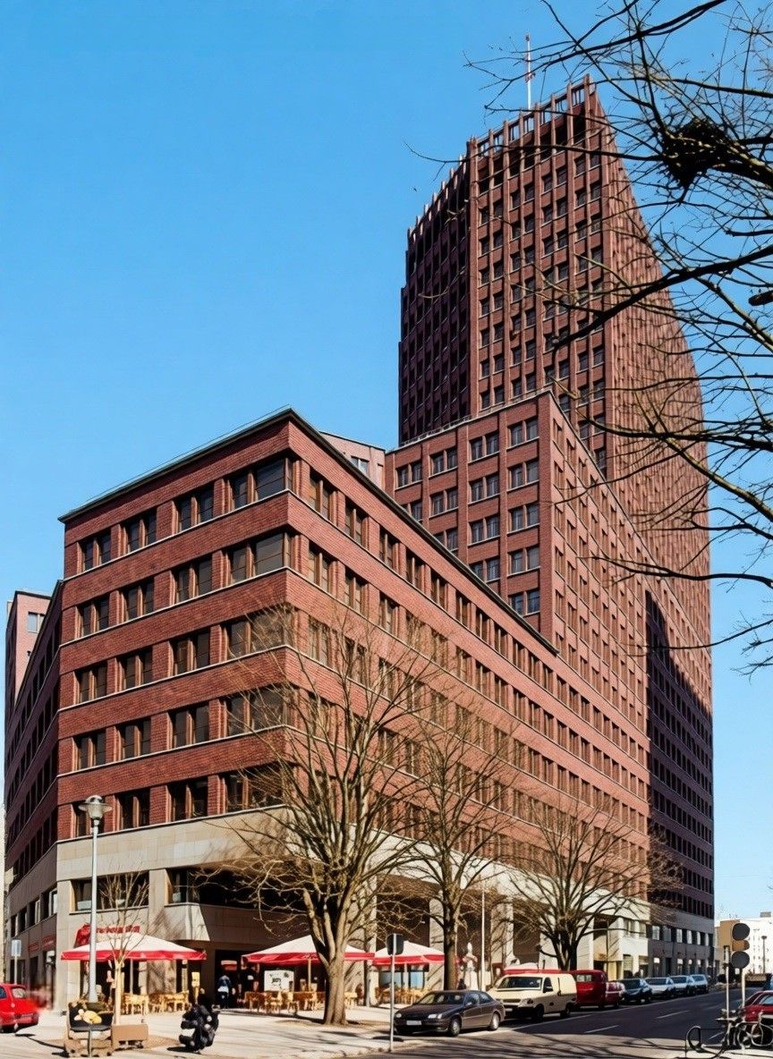 Городская корона Кольхофа, чьи золотые выступы при солнечном свете видны издалека, образует вместе с расположенной напротив стеклянной башней Хельмута Яна световую макушку, которую по-настоящему можно оценить только ночью, очень своеобразную архитектурную игру: здесь – традиционно принятый куб, скорее всего построенный вручную камень за камнем; там – открытый полуцилиндр, чей фасад более близок к тому, чтобы разрушиться, а не состариться. Соперники и кирпичная башни являются воздвигнутыми манифестами. Совей формой и своим материалом они воплощают противоположные архитектурные позиции, которые превратили Потсдамскую площадь вместе с двумя дюжинами новостроек в подиум для демонстрации архитектурной моды. За кулисами этой новосозданной сцены мастера строительства обсуждают теории.