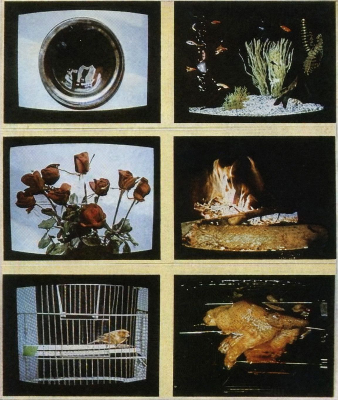 Сюжет «видеокартин» — нового вида убранства жилой квартиры: работающая стиральная машина, аквариум с рыбками, букет роз («не надо менять воду, цветы получают её от магнитной ленты»), растопленный камин, канарейка в клетке, поджаривающаяся на вертеле курица. В отличие от обычных видеофильмов «картины» снимаются неподвижной камерой, зафиксированный ею процесс протекает в реальном времени. Автор концепции М. Маццанти (Италия)