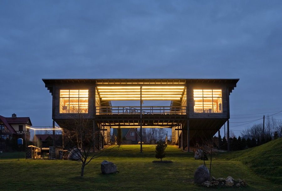 Место, где теперь стоит дом, мне показал мой друг. Участок имеет наклонный рельеф. Вокруг — река, поля, леса, деревни, виден ближайший город. Дух захватывает! Сначала я хотел одноэтажный дом, но затем понял, что со второго этажа будет видно ещё больше, а именно в этом и заключалась основная идея — видеть всё вокруг. Семья большая, часто бывают гости, и у всех разные ритмы жизни, поэтому возникли два объёма, объединённые единой кровлей, связанные лестницами и террасами, где все встречаются и проводят время вместе. В одном доме мы живём, а другой, с баней и мастерской, — для гостей. Между ними — озеленённый внутренний двор. Очертания крыши подчёркивают линию горизонта. На ней есть скамейка, где можно отдохнуть, созерцая прекрасный закат, отражающийся на ровной водной глади реки. Место оказалось ветреным, поэтому летом нет комаров, а зимой снега. Внизу, под домом, много свободного пространства, ввиду чего отпадает необходимость в дровянике — я храню дрова прямо там, между опор. Дом сам собой образовал множество разных сценариев, которые изначально даже не подразумевались, но так удачно его дополнили.