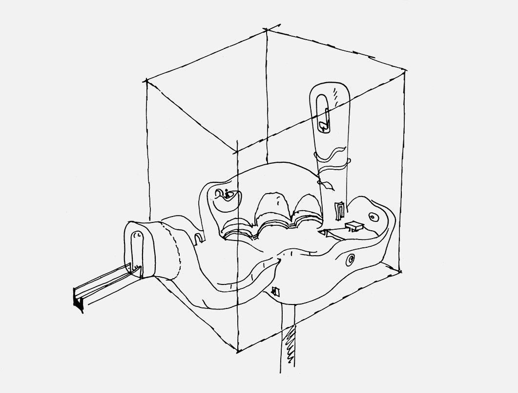 А. Б. Это был конкурсный, по-моему, середины 1970-х годов, проект на волнующую тему храма в атеистической стране. Понятно, что это такое. Это гроб с телом: куб, внутри которого — нечто естественное. Нас с ним в то время волновали, а меня волнуют до сих пор, сочетания ортогональных и неортогональных свободных геометрий. И у Вадима были замечательные рисунки на эту тему про живое, антропоморфное тело, помещённое в жёсткий периметр и не касающееся его.