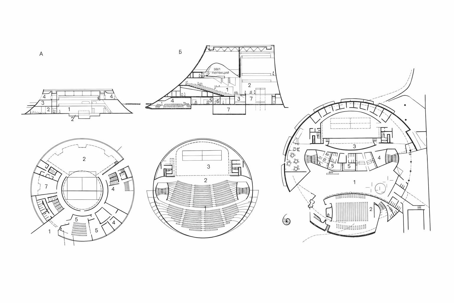 Дом культуры в Гавре, 1981 г. Планы, разрезы. А — зал многоцелевого назначения. План: 1— зал приемов, 2 — трансформируемый зал от 300 до 600 мест, 3 — театральная студия, 4 — студия звуко- и видеозаписи, 5 — зал хранения записей, 6 — аудитория на 80 мест, 7 зал хранения документации. Разрез: 1 — зал, 2 — аудитория, 3 — конференц-зал, 4 — конторские помещения. Б — театр. План верхнего уровня: 1 — зал на 1155 мест, 2 — просцениум (или оркестровая яма), 3 — сцена. План нижнего уровня: 1 — зал для приемов и выставок, 2 — кинозал или конференц-зал на 300 мест, 3— оркестровая яма, 4 — артистические помещения, 5 — санузлы для зрителей. Разрез: 1 — театральный зал, 2 — сцена, 3 — оркестровая яма, 4 — кинозал, 5 — зал для приемов и выставок, 6 — санузлы, 7 технические помещения.