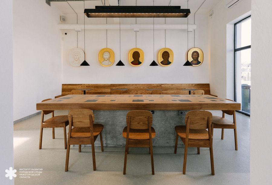Аналогично повествованию в пространстве ТП-РП 2820 об истории Стрелки и утраченного грузового порта, мы хотели рассказать и о культуре, связанной с многолетней работой Нижегородской епархии по укреплению иконописных и реставрационных традиций. Благодаря доверию и поддержке митрополита Георгия эта идея воплотилась в двух ключевых объектах интерьера: полиптихе, рассказывающем об этапах работы по созданию икон; и всей деревянной мебели в заведении. Полиптих выполнен мастерами иконописной мастерской Нижегородской епархии, а деревянная мебель по нашим авторским эскизам реализована мастером их столярно-реставрационной мастерской. Хорошо, что через этот проект удалось показать работу мастеров церковных служб. Судя по добрым отзывам, это получилось уместно и гармонично.