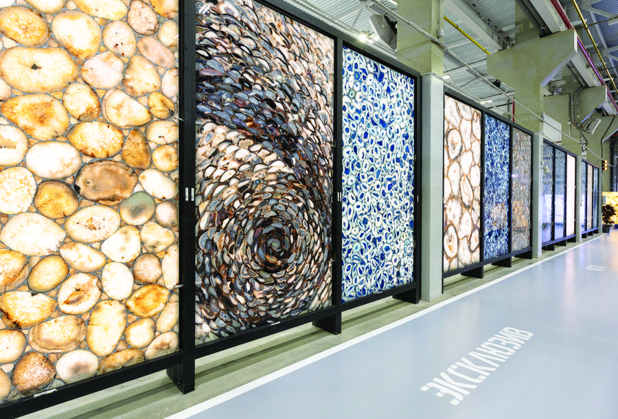 В каталоге Venezia Stone – более 1000 видов камня со всего мира. Это не только классические гранит и мрамор, но и редкие породы, которые становятся инструментом архитектурной выразительности: кварциты с высокой износостойкостью для зон с интенсивной проходимостью, ониксы, работающие на просвет, травертины с трендовой фактурой, эксклюзивные коллекции бразильского и итальянского камня премиум-уровня. При этом Venezia Stone не ограничивается натуральным камнем. В ассортименте компании – актуальная коллекция архитектурного терраццо в современных оттенках и высокотехнологичный кварцевый агломерат под брендом Etna Quartz. Это позволяет архитектору в рамках одного проекта закрывать самые разные задачи: от монументального фасада до столешницы или панно как арт-объекта.