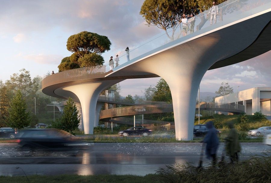 Как объединить пешеходный мост и рекреационное пространство? Ответом на этот вопрос для архитекторов студии ATRIUM стал проект пешеходного моста-парка в Алма-Ате. В их концепции мост – не просто путь из точки А в точку Б, а извилистый парк над трассой, связывающий две зеленые зоны города. Особое внимание в проекте уделено также художественной ценности объекта: его форма вдохновлена традиционным казахским орнаментом, что позволяет сооружению гармонично вписаться в природный и культурный контекст.