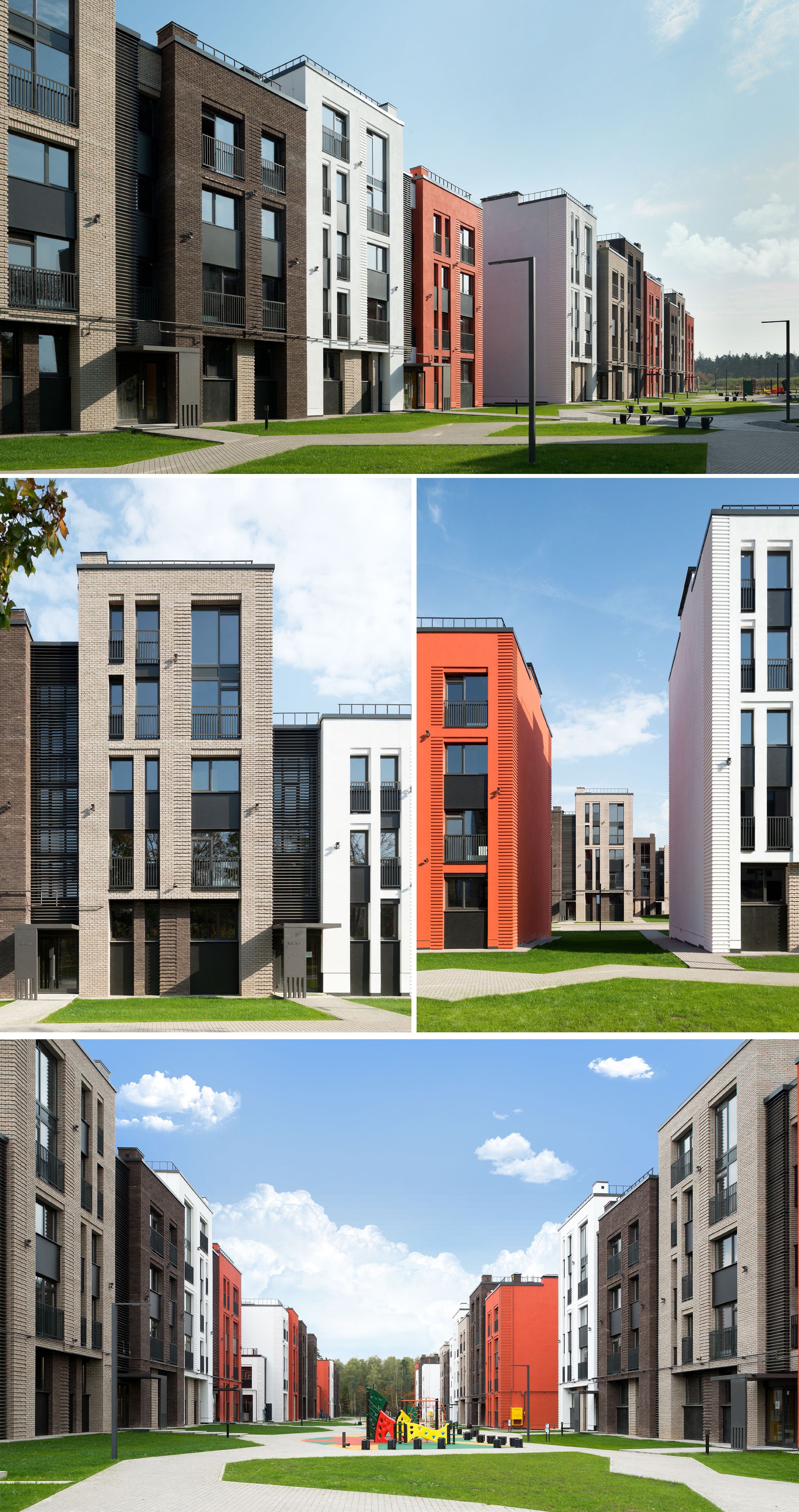 В связи с этим в «Квартале» нет места высотной застройке. Архитекторы разработали пять типов жилых единиц, где каждый дом имеет особые индивидуальные характеристики. Помимо проблемы визуальной идентификации также решен вопрос комфорта на уровне среды и каждой квартиры в отдельности. Таким образом, зоны отдыха, спортивные и детские площадки были отделены от проезжей части и вынесены во внутренний двор, куда можно попасть прямиком из подъезда.