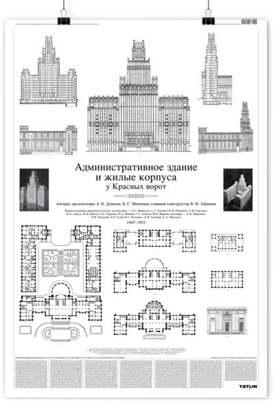 В 1946 году в конкурсе на административное здание у площади Красные Ворота выиграл архитектор Алексей Душкин. Проект был утвержден постановлением Совета Министров СССР наряду с другими сталинскими высотками. Однако в 1947 году Душкину назначили соавтора — архитектора Бориса Мезенцева. Решение было принято главным архитектором Москвы Дмитрием Чечулиным якобы в силу сложности проекта. Впоследствии вариант, предложенный Душкиным, был переработан. Совместный проект Душкина и Мезенцева был окончательно готов лишь в 1951 году, когда строительство уже вовсю шло. В новой версии здания центральный объём обзавёлся несколькими последовательно уменьшающимися ярусами и квадратным аттиком с обелисками по углам; боковые объёмы стали выступать вперёд; появился портик главного входа. Этот вариант стилистически более близок другим высоткам. В плане здание п-образное, что связано как с требованиями к жёсткости конструкции, так и с желанием разделить административные и жилые помещения. В центральной части 24 этажа: там удалось разместить 300 кабинетов, 7 залов заседаний, 1 актовый зал и подсобные помещения. В боковых частях в 11–15 этажей поместились 276 квартир, вестибюль выхода из метро, магазин, прачечная и ясли. Цокольный этаж занимают технические помещения и гараж, крышей которому служит двор здания. Одной из самых сложных задач было связать цокольный этаж со станцией метро «Красные Ворота»: это удалось реализовать благодаря Душкину, который имел опыт проектирования для метрополитена. Плакат включает чертежи первоначального проекта, фото макетов и статью, раскрывающую идею и историю проекта.