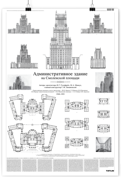 Одной из целей строительства высотки было создать ориентир в перспективе Бородинского моста и Смоленской улицы. Проект поручили архитекторам Владимиру Гельфрейху и Михаилу Минкусу, а также конструктору Григорию Лимановскому. Требовалось расширить площадь, построенную в XIX веке: её решено было сделать в виде трапеции, чтобы главный фасад здания осью выходил на большее основание. Фасад выделяется резким вертикальным членением объёмов и сравнительно небольшим масштабом архитектурного декора — в верхней части можно увидеть «каменное кружево», в то время как нижняя часть более монументальна за счёт мощных пилонов, завершённых аттиками с крупными картушами. Планировка здания соответствует административной функции. На цокольном этаже находятся гардеробные, зона технического обслуживания, камеры мусороудаления и пылеудаления. Выше, с 1 по 27 этаж, расположены холлы, коридоры и кабинеты, сгруппированные вокруг лифтов. Интерьеры в отдельных зонах украшены витражами из гранёного стекла. Здание — единственная сталинская высотка без звезды на шпиле. Изначально шпиля в проекте не было, добавить его решили ближе к завершению строительства: для этого пришлось пробить 5 верхних этажей, а сам шпиль сделать из лёгкого листового металла, выкрашенного под камень, так как каменную конструкцию здание бы не выдержало, как и звезду. Плакат включает чертежи первоначального проекта, фото макетов и статью, раскрывающую идею и историю проекта.