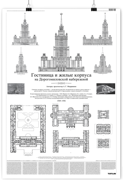 Строительство высотки на Дорогомиловской набережной представлялось важным с точки зрения развития района, который превращался из промышленной окраины в парадный участок у Кутузовского проспекта. Проектирование поручили архитекторам Аркадию Мордвинову и Вячеславу Олтаржевскому вместе с конструктором Павлом Красильниковым. Одной из главных проблем при строительстве стала проблема грунтов: из-за близости Москвы-реки пришлось осушить участок и установить систему иглофильтрового водопонижения, которая впоследствии стала яркой особенностью здания. П-образное в плане строение можно разделить на несколько частей: в центральной 34-этажной разместилась гостиница «Украина»; в боковых высотой от 9 до 11 этажей расположились квартиры. Центральная часть для монументальности приподнята на стилобате. Ко входу с деревянными дверями под арочными навершиями ведут гранитные лестницы. Фасад украшен скульптурами в виде пятиконечных звёзд и вазонов с колосьями. На цокольном этаже находятся трансформаторная подстанция, тепловой пункт, насосная станция, прачечная, ремонтные службы, склады, дренажная система для откачки воды. На 1 этаже — зал регистрации, рестораны и торговая галерея. Пространство украшено живописным плафоном «Праздник труда и урожая на хлебосольной Украине» и советской скульптурой середины XX века. Стены облицованы натуральным камнем и краской и фрагментарно декорированы позолоченными светильниками. На этажах выше — стандартная коридорная планировка. Отличительной особенностью номеров для гостей являются фанерованные филёнчатые двери, мраморные подоконники и полы из дубового паркета. Плакат включает чертежи первоначального проекта, фото макетов и статью, раскрывающую идею и историю проекта.