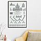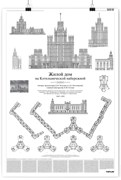 Высотка расположена в одном из самых живописных мест города — на возвышении, именуемом «Вшивая горка», у слияния рек Москва и Яуза. С 1938 по 1940 год здесь велось строительство высотных зданий, одним из которых было здание по проекту архитектора Андрея Ростковского. Строительство было прервано войной и возобновлено лишь несколько лет спустя: тогда решено было включить здание в комплекс на Котельнической набережной, а Ростковского сделать членом авторского коллектива наравне с архитектором Дмитрием Чечулиным и конструктором Львом Гохманом. Возведение началось в 1947 году. Из-за культурного слоя и грунтовых вод на участке использовалось искусственное свайное основание, технологически схожее с основанием гостиницы «Ленинградская». Здание представляет собой три соединённых корпуса: правый по Котельнической набережной, левый по Подгорской набережной и центральный высотный. Корпус «на Котельнической» выделяется обильным декором: цоколь облицован крупными колотыми блоками розового гранита; выше здание отделано керамическими плитами; в центре композиции — ризалит, завершённый двумя башенками с горельефами, изображающими серп и молот. Корпус «на Подгорской» во многом повторяет этот декор. Примечательно, что на 1 этаже расположен кинотеатр «Иллюзион» (ранее — «Знамя»), вход в который оформлен высокой аркой, украшенной барельефом «Музы творчества». И сегодня здесь можно посмотреть классику советского и мирового кинематографа. Центральная часть в 33 этажа направлена в сторону Кремля и отличается резким вертикальным членением фасада, которое усиливает монументальность комплекса. Дом достроили к 1952 году и спустя некоторое время заселили выдающимися деятелями СССР. Плакат включает чертежи первоначального проекта, фото макетов и статью, раскрывающую идею и историю проекта.